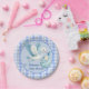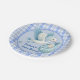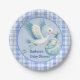 An Adorable Personalised Blue Plaid Paper Plate With Baby And Stork For A Baby Boy Shower.