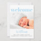 A simple and sweet baby announcement for your baby boy. On the front, "welcome" is written in modern blue typography over a photo of your baby; underneath, you can add his name, arrival date, weight and length in a soft dark grey typography. On the reverse side you can add three additional photos, as well as the names of his delighted parents and siblings. Photo tip: for best results, the photos on the front and on the bottom of the back should be rectangular and the top two photos on the back should be square or have their subjects in the middle.