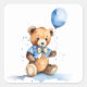 Cute watercolor illustration of a baby boy teddy bear with a blue balloon and bow ties on a white background.