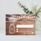 RUSTIC COUNTRY MASON JAR WEDDING RSVP CARD | Wooden background with string of lights, mason jar containing baby's breath flowers and your wedding wording in white. Find other barnyard wedding rsvp cards at http://www.zazzle.com/special_stationery*
