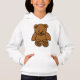 A cute baby brown cartoon bear on the front of a girls white hooded sweat shirt with pockets a fun outfit