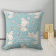 An adorable white bunny rabbit holds a pink flower in the pattern on this baby nursery throw pillow. Near the bottom is an oval with baby's name and birth date. Everything is placed on a medium blue background. The back of the pillow has the same pattern without the oval or text. A cute baby shower gift!