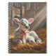 A white calf with a pink bow tied around its neck is laying in straw in a barn stall with sunbeams