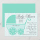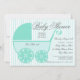 Soft turquoise baby carriage and a pin stripe background. Change text as needed.