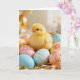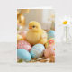 A fluffy yellow chick nestles among decorated eggs on this darling Easter card. Very cute!