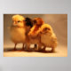 A vibrant, full-colour photograph of four baby chicks, including a buff orpington pullet and three assorted bantams.