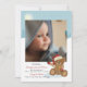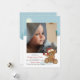 Their first impression of this holiday birth announcement will be "So Cute!" A sitting teddy bear dressed in mittens and a tail hat is introducing your new arrival. The wintery background has snow and a forest of blue trees. (by balasoiu - freepik.com/free-vector/christmas-card-with-cute-teddy-bear_801597.htm#term=christmas%20bear&page=1&position=1).