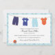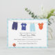 These adorable baby shower invitations feature the cutest baby boy clothes strung along a clothesline.