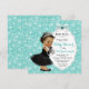 Teal blue Baby & Company baby shower invitation with adorable Hispanic Indian African American ethnic baby girl wearing black dress and pearls on a beautiful teal blue background. This adorable black and teal blue baby shower invitation is easily customised for your event by simply adding your details. This elegant design is perfect for a theme, or Breakfast at s theme baby shower.
