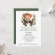 Adorable little baby cowboy sitting on a rolling wooden horse, surrounded by cactus plants, decorates the top of this baby shower invitation. A solid white background on the invitation has clean olive green custom text ready to personalise for your event. Lovely baby shower invitation with a western flare.
