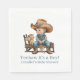 Yeehaw it's a Boy! Western themed baby shower paper napkins, with adorable graphics of a baby boy cowboy sitting on a wooden bench. Personalise the blue text to suit your event needs.