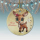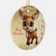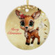 Celebrate the holiday season with this gold festive round ceramic ornament featuring an endearing woodland forest animal cartoon graphic of a cute baby deer with poinsettia flowers tucked in the fawn's ear, and Merry Christmas written in red. Perfect for decorating your tree or as a thoughtful gift, this whimsical floral doe decor makes a cherished keepsake for years to come. Customise by changing the text, the font, the font colour, or remove the text. You can even transfer this design onto other products. Enjoy this design your way! Check out ForestBabies Xmas Deer Collection for matching decorations. 🎄🦌