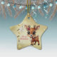 Celebrate the holiday season with this gold festive star ceramic ornament featuring an endearing woodland forest animal cartoon graphic of a cute baby deer with poinsettia flowers tucked in the fawn's ear, and Merry Christmas written in red. Perfect reindeer with antlers for decorating your tree or as a thoughtful gift, this whimsical floral doe decor makes a cherished keepsake for years to come. Customise by changing the text, the font, the font colour, or remove the text. You can even transfer this design onto other products. Enjoy this design your way! Check out ForestBabies Xmas Deer Collection for matching decorations. 🎄🦌