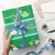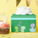 Wrap your gifts in adorable style with this cute baby dinosaur gift wrapping paper. Wrapping paper has a pattern of baby dinosaurs and cute purple butterflies (and one baby dinosaur is even hatching out of his shell!). Also in the pattern are palm trees, rainbows, and suns. Personalise the gift wrap with your son or daughter's first name.