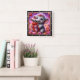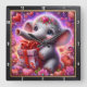 This enchanting square wall clock features a heartwarming digital illustration of a cheerful baby elephant with large, sparkling blue eyes. The elephant is wearing a delicate floral crown adorned with a central heart and is joyfully holding a large, pink gift box wrapped with a red satin ribbon. The scene is set against a vibrant, dreamlike background filled with swirling magenta and purple nebula effects, glowing stardust, and dozens of floating hearts. Lush pink roses and floral accents frame the bottom of the composition. The artwork is encased in a modern black wood-grain frame with bold white numeric markers for easy readability. This functional home accessory is a perfect decorative piece for nurseries or as a heartfelt gift for Valentine Day, birthdays, and anniversaries.