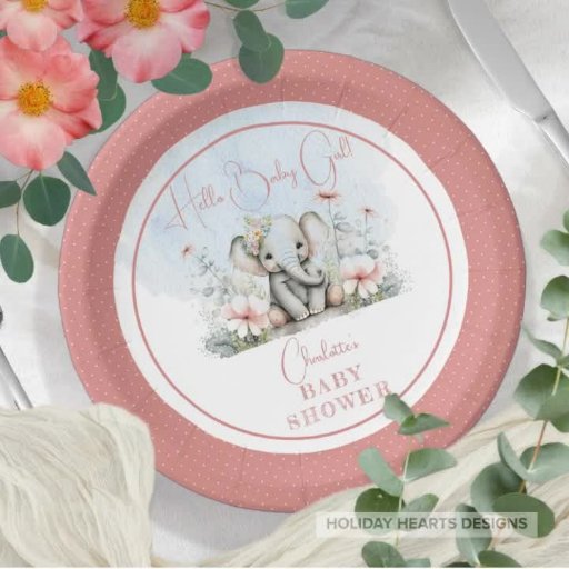 Sweet baby elephant nestled cosily among the flowers "Hello Baby Girl!" Baby Shower design.