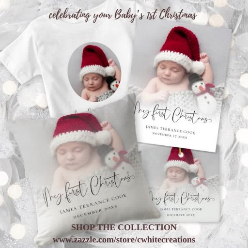 Baby First Christmas Custom Photo Overlay. A celebration of your baby's 1st Christmas. Replace the sample image with your own favourite. My First Christmas is in a stylish set script and easily personalise with name and the year.