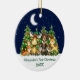 Baby's First Christmas Watercolor Woodland Animals Forest Animals Pine Trees Moon, Starry Sky and Snow Ceramic Ornament . Baby Animals include Bear, Deer, Moose, Racoon, Bunny Rabbit, Fox and Owl with forest greenery and holiday string lights. Add Name.