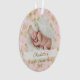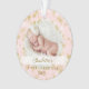 Magical gold snowflake border baby's first Christmas photo keepsake ornament. Pink and gold baby's first Christmas keepsake ornament can be customised with the baby's name, the year, and one photo on the front and one on the back.
