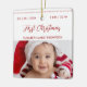 This custom Christmas ornament highlights all the important details: the date of birth and birth stats (weight, length, time) are elegantly presented at the top. The heartfelt phrase "First Christmas" is beautifully rendered in elegant calligraphy, while your baby's name appears in a clean, modern font just above the photo. A delightful curly line detail gracefully frames the top, adding a sweet, whimsical touch.