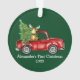 Baby's First Christmas Watercolor Vintage Red Truck with Tree and Baby Moose Green Ornament. Add Name.