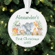 Baby's First Christmas Watercolor Safari Baby Animals Ornament. Baby Animals include Elephant, Monkey, Giraffe, Rhino, Zebra and Lion on fern leaves. Watercolor Botanical Greenery. Green Text. Add Name.