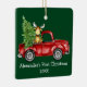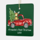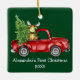 Baby's First Christmas Watercolor Vintage Red Truck with Tree and Baby Moose Green Ornament. Add Name. Photo Back.