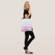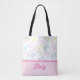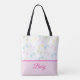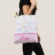 All purpose baby diaper tote bag, with a colourful pastel baby foot print pattern, on the top half of the bag, and solid pink, on the bottom. Baby in custom bright pink text is ready to personalise to read what you want.