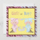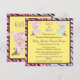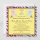 Adorable personalised Baby Gender Reveal party Baby Shower invitations with cute cartoon babies and toy bunnies on a yellow background with a pretty brown frame with pink and blue animal print. Text is fully customisable to meet your needs and design objects can be ved and re-sized. The invitations are illustrated on both sides. www.resaleclipart.