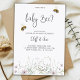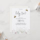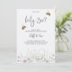 A baby gender reveal invitation card features delicate floral illustrations at the bottom with two bees buzzing above elegant script text. The back is a plain, light textured design. The tone is inviting and whimsical.