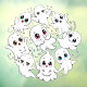The image features a collection of cartoon ghosts against a black background. The ghosts are white with large, expressive eyes in various colours, including blue, green, and brown. Some ghosts have pumpkin-like grins carved into their bodies, while others display different facial expressions, such as smiling, winking, or pouting. Original Vector Art Copyright BluedarkArt TheChameleonArt.