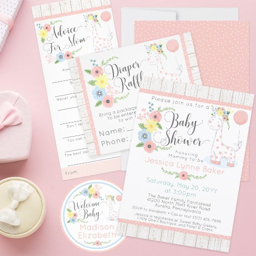 Precious baby giraffe with lovely floral crown - the sweetest design for your giraffe themed baby shower, first birthday party, and more! Light and soft pastels accented with rustic white wood background. An ideal way to celebrate with shabby chic zoo or farmhouse country style!
