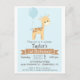 Baby giraffe with balloon, jungle, zoo animals, safari theme neutral, boy or girl birthday party invitation. Personalise this cute, retro feel invite with your child's name. Cute, simple, plain design. Perfect for baby's first, 1st, birthday, toddler, young children, or older kids. Colours include pastel blue and brown.