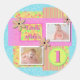 Make that first birthday extra special with this fun round sticker featuring a cute pink,yellow, green and aqua scrapbooking design. Add two cute photos for a personalized celebration. Team with the matching ribbon, card and gift bags.