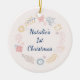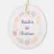 This Christmas ornament features a whimsical floral wreath. Personalise the front with your own text and add your photo to the back.