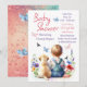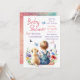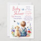 Girl's Baby Shower Invitations. Pretty watercolor style ai art depicting a back view of a baby girl sitting with her little puppy white Lab dog. They are surrounded by flowers, butterflies and birds. Colours used are pink, purple, red and blue. The baby girl is wearing cute little overalls and has some cute curly blonde hair.