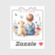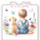It's a Girl sticker. Pretty watercolor style ai art depicting a back view of a baby girl sitting with her little puppy white Lab dog. They are surrounded by flowers, butterflies and birds. Colours used are pink, purple, red and blue. The baby girl is wearing cute little overalls and has some cute curly blonde hair.