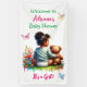 Girl's Baby Shower Welcome Banner. Cute little African-American baby girl with a teddy bear sitting on the grass and flowers in a watercolor style. Pink, yellow and blue flowers surround them. Colours used are pink, green, yellow and blue.