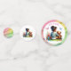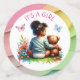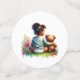 It's a girl baby shower confetti. Cute little African-American baby girl with a teddy bear sitting on the grass and flowers in a watercolor style. Butterflies and flowers surround them. Colours on graphics are pink, green, yellow and blue.
