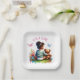 It's a girl baby shower paper plates. Cute little African-American baby girl with a teddy bear sitting on the grass and flowers in a watercolor style. Butterflies and flowers surround them. Colours on graphics are pink, green, yellow and blue.