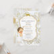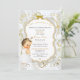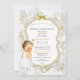 Beautiful baby girl in her christening dress and gold cross necklace. Invitation background is white satin, gold filigree, a gold and silver glitter frame and bow embellishment. Back is adorned with gold flower pattern & gold ribbon on a white satin background.