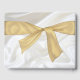 Beautiful baby girl with brown eyes in her christening dress and gold cross necklace. Background is white satin with a gold and silver glitter frame and bow embellishment. Back is adorned with gold ribbon on a white satin background.