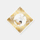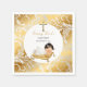 Baby girl in christening dress with gold cross necklace sleeping on a pillow. Background is gold with silver scroll work.