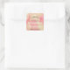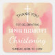 This sticker is designed to be used with a thank you gift for guests of your baby girl's christening. A pink and gold watercolor background is accented with a white cross and custom text for the baby's name and date of christening.