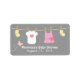 Cute baby clothes like socks, baby suit and tiny dress hanging on the clothesline over a grey background. A butterfly flies by signifying spring with the arrival of the baby girl. A perfect label for baby shower party favour gifts. Personalise easily within text space available.