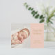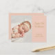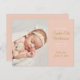Modern gold script photo baby girl, birth announcement card to introduce your beautiful newborn baby. The front features a photo of your baby along with chic gold and white text for your baby's name and birth stats on a peach panel that you can customise to a colour of your choice. The reverse has golden stars on strings on a matching peach background. Designed by Thisisnotme©