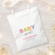 Cute baby shower favour bag design features polka dot and stripe patterned letters and custom text that can be personalised with the mother's name and event date. Light pink with purple, pink, chartreuse green, orange, and grey colours. Perfect for welcoming a baby girl!
