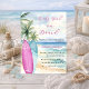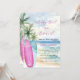 An elegant invitation for a Baby Shower, A watercolored sandy beach, ocean waves and palm trees as background, and a pink and blue surfboard on the beach.