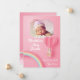 Beautiful, sweet baby pink birth notifications with an adorable little puppy flying up in the clouds inside a heart shaped hot air balloon near a rainbow.