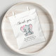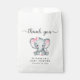 Cute thank you party favour bags for your baby girl shower with "thank you" written in a soft grey script with swashes and a pastel pink watercolor of a baby elephant. Personalise the mother-to-be's name and shower date in simple grey typography.